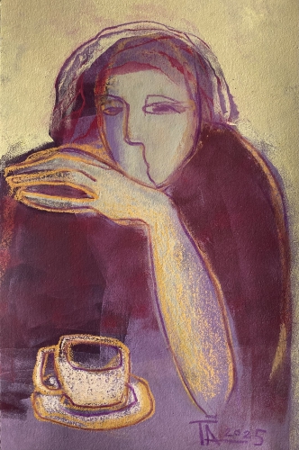 With a cup of coffee. 2025, cardboard, acrylic, oil pastel, 50 x 34 cm. Sold.